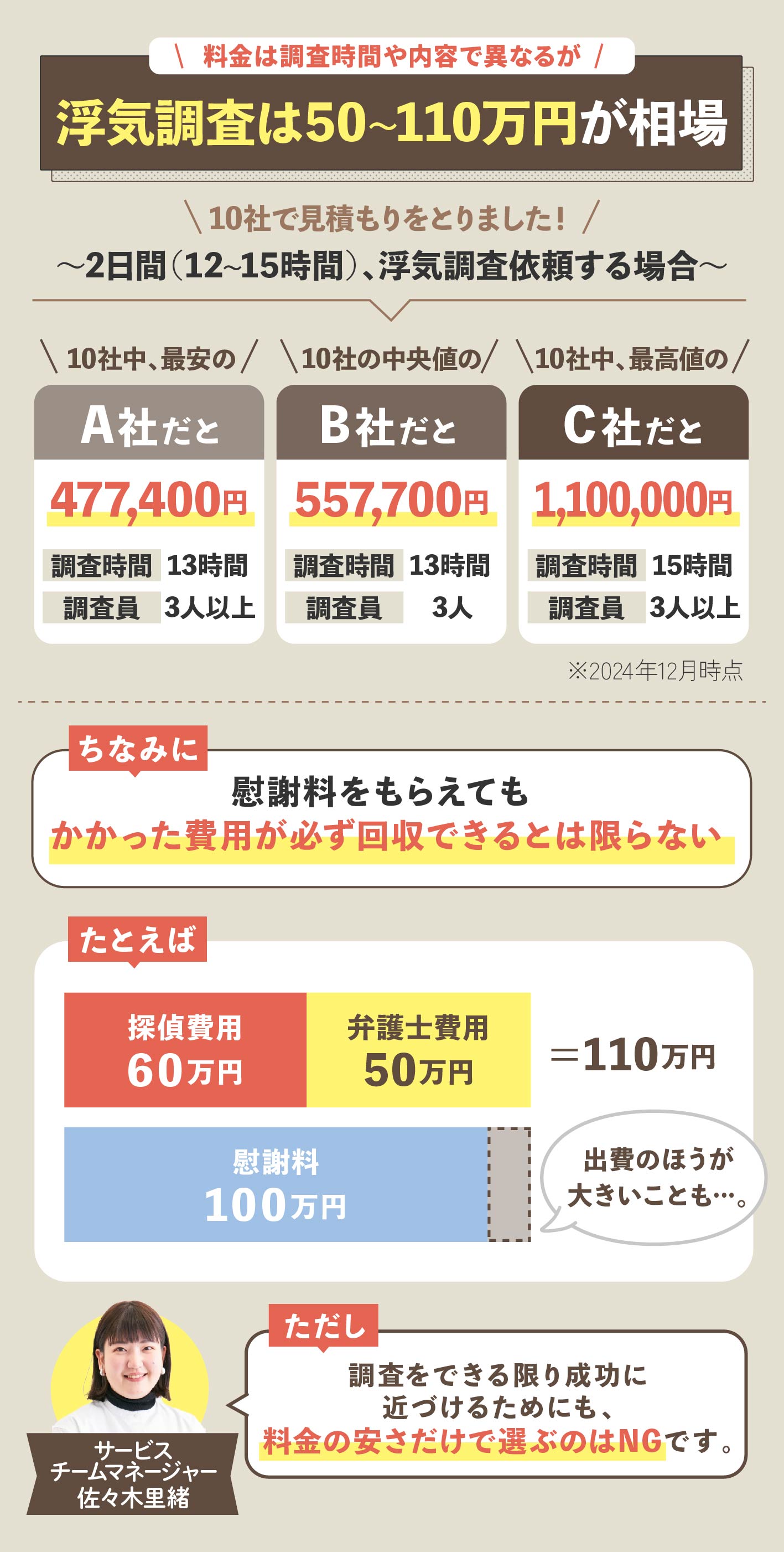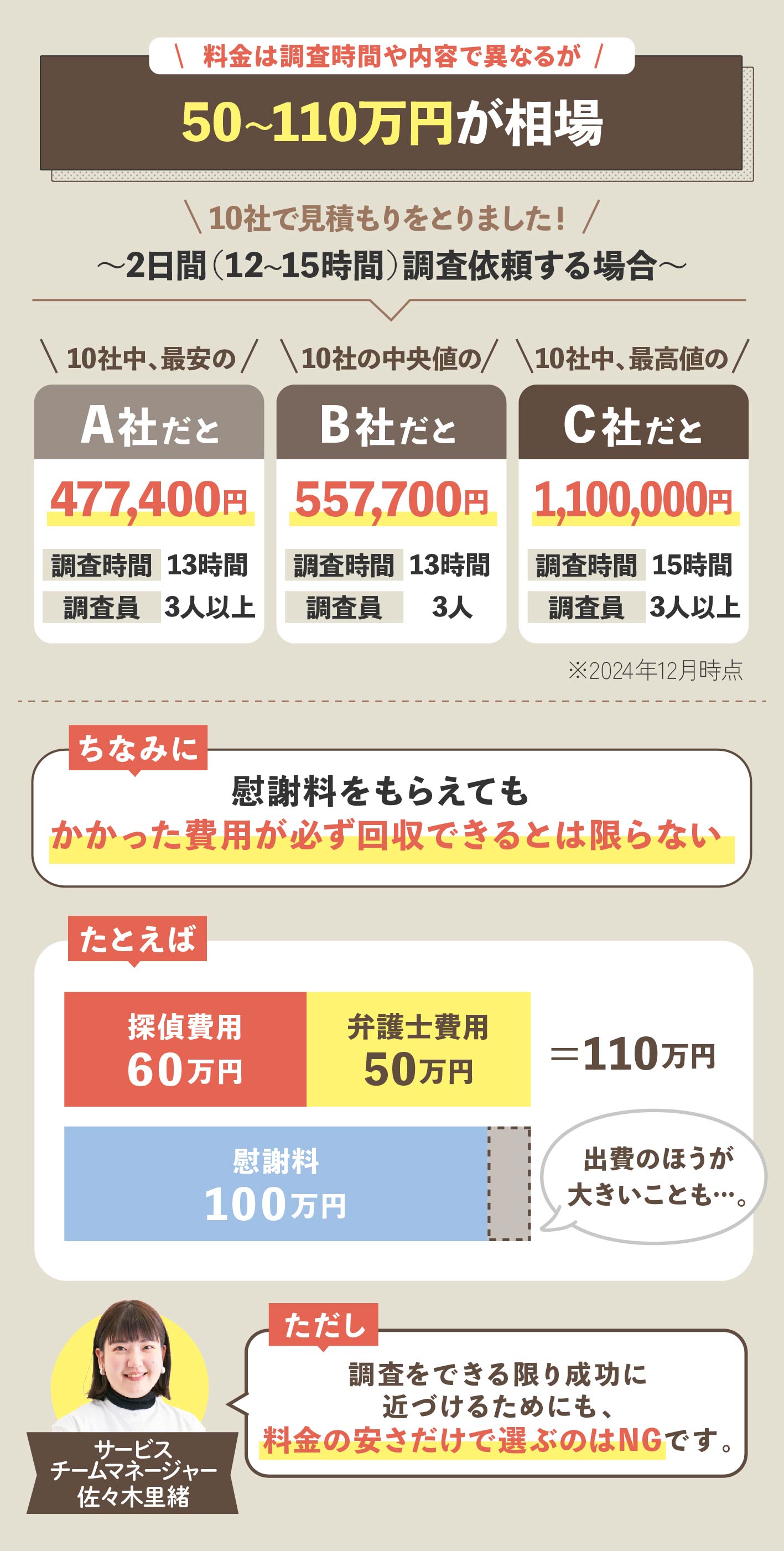 検索やおすすめで出てくる探偵社が13~15時間の条件(2日間)で50~110万円が相場の中、当事務所では28~33万円となります。