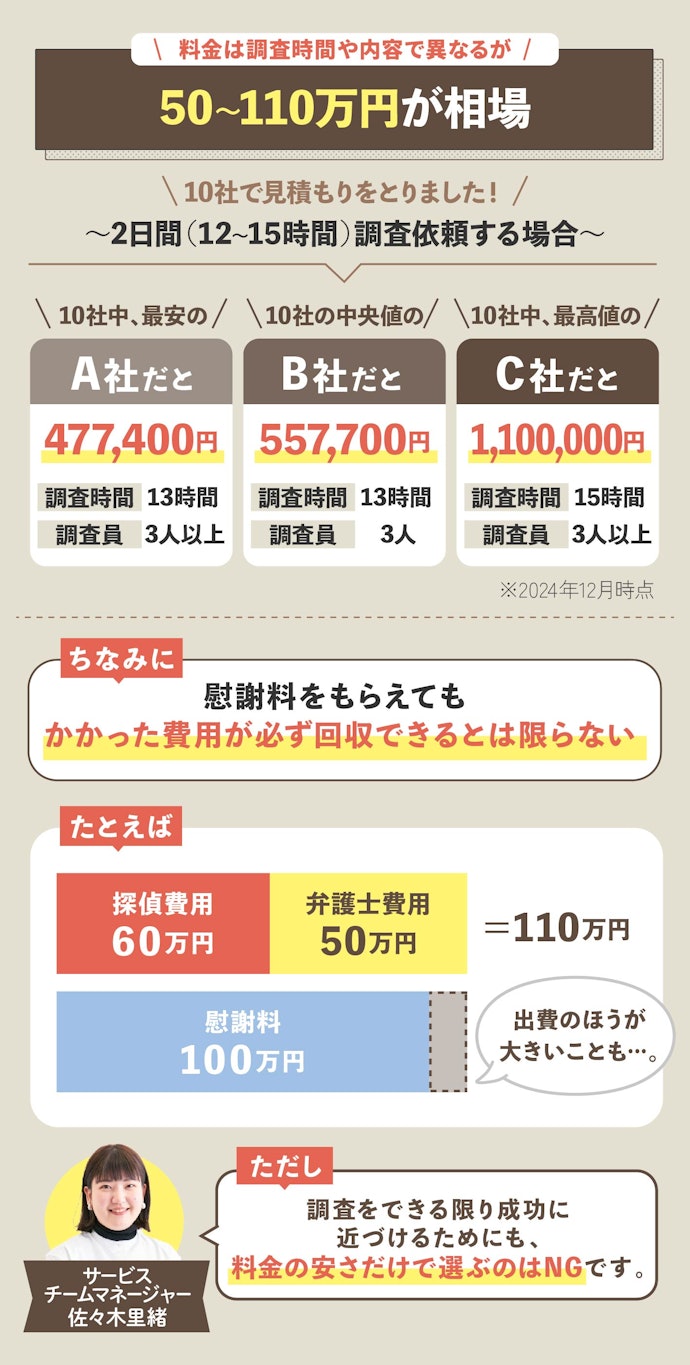 検索やおすすめで出てくる探偵社に比べ、総額で半値以下になる